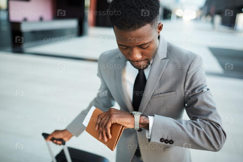 Черный бизнесмен смотрит на часы в аэропорту