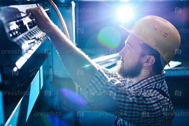 Серьезно сконцентрированный красивый молодой инженер в жесткой шляпе, стоящий у панели управления промышленной машины и изучающий ее, эффект свечения линзы