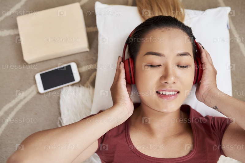 Улыбающаяся женщина наслаждается музыкой