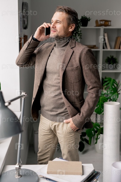 Уверенный в себе зрелый архитектор со смартфоном стоит у окна офиса