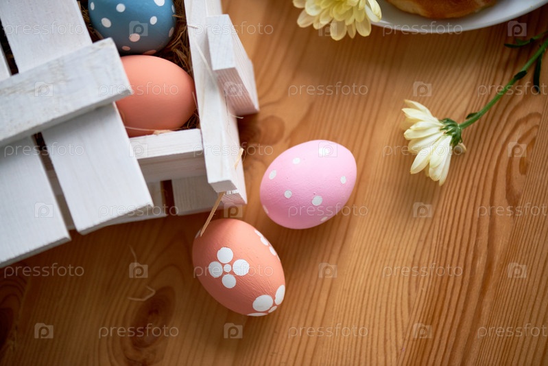 Подготовка к празднованию Пасхи: высокоугольный вид красивых красочных яиц на деревянном столе