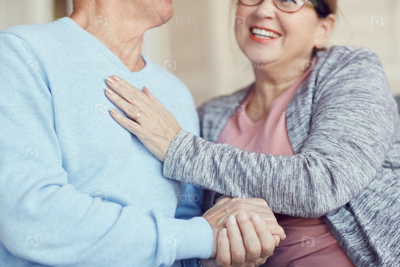 Близкий план возбужденной супружеской пары старшего возраста в повседневной одежде, держащейся за руки и смеющейся во время разговора друг с другом