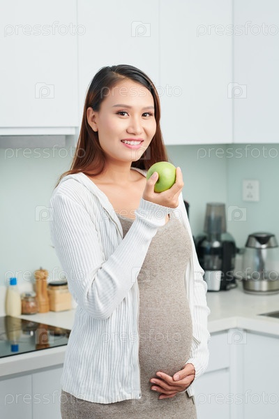 Беременная женщина ест яблоко