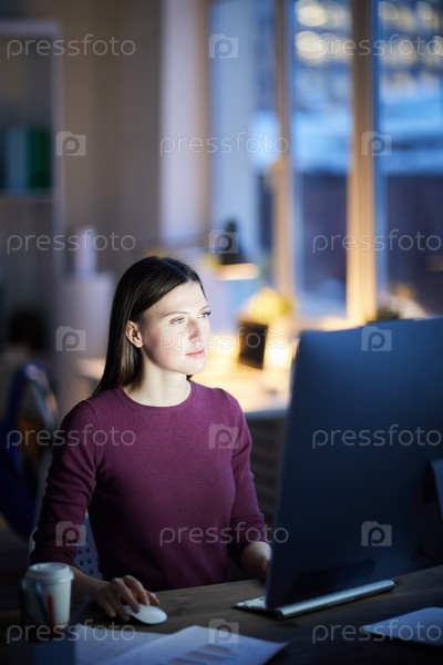 Контент занятая привлекательная молодая женщина в обычном свитере, сидящая за столом и использующая современный компьютер во время поздней работы в офисе