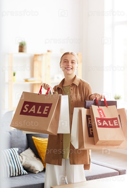 Счастливая молодая женщина в длинной рубашке стоит в гостиной и держит бумаги для покупок, наслаждаясь выгодными рекламными акциями