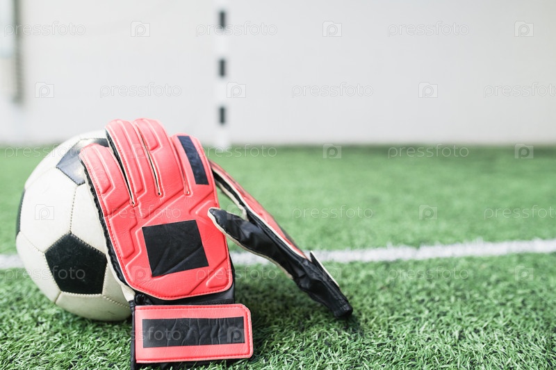 Кожаные перчатки футболиста на футбольном мяче по белой линии на зеленом пустом поле
