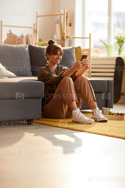 Веселая привлекательная девушка с волосами, сидящая на ковре в гостиной и серфующая по сети со смартфоном