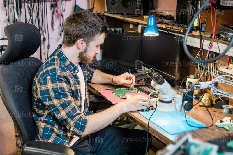 Молодой серьезный мастер-ремонтник с маленьким стальным ручным инструментом, ремонтирующим демонтированную сенсорную панель
