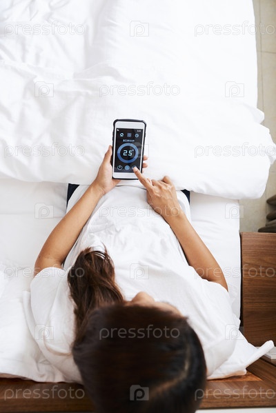 Женщина удаленно устанавливает температуру в своей спальне