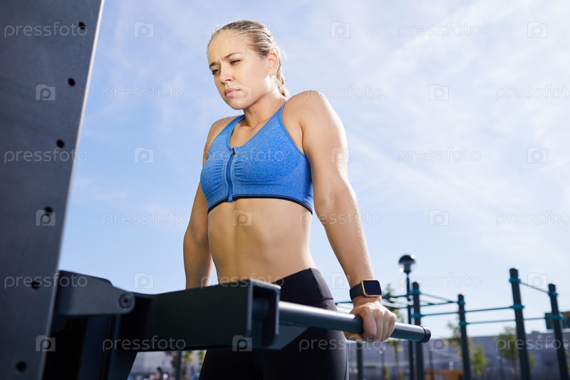 Серьезная привлекательная молодая блондинка в спортивном бюстгальтере, держащая прямые руки во время тренировок на параллельных барах