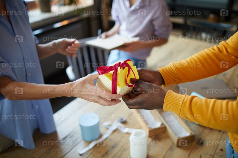 Близкий план неузнаваемых ремесленников, настраивающих бумажный подарочный ящик в мастерской: женщина дарит желтую коробку с красной лентой черному мужчине