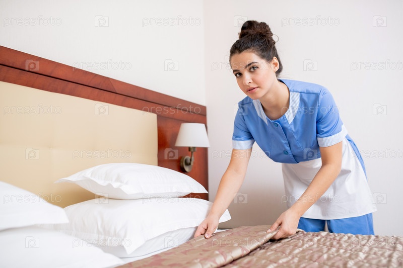 Молодая брюнетка-женщина в синей форме горничной, наклоняющаяся над кроватью