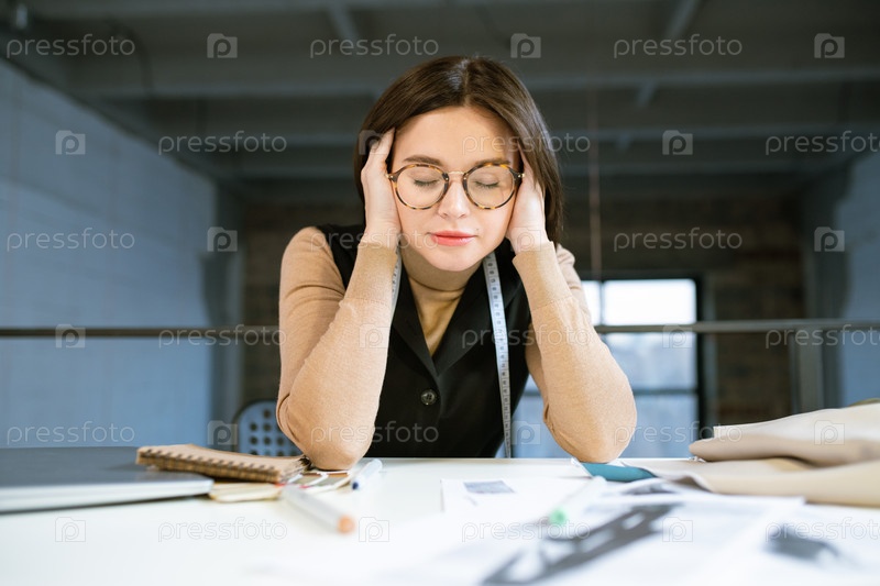 Молодая сконцентрированная или уставшая женщина-дизайнер касается головы во время работы в студии