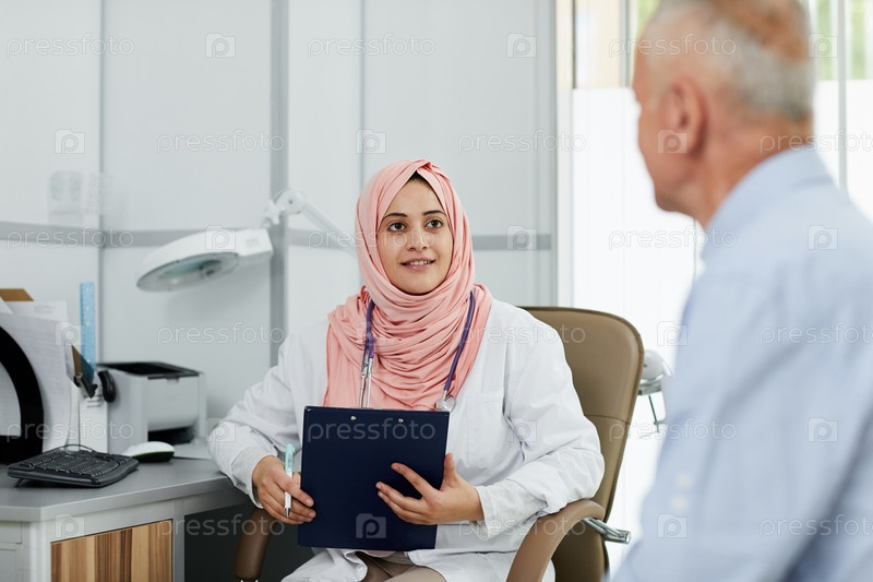 Ближневосточная женщина-врач разговаривает с пациентом