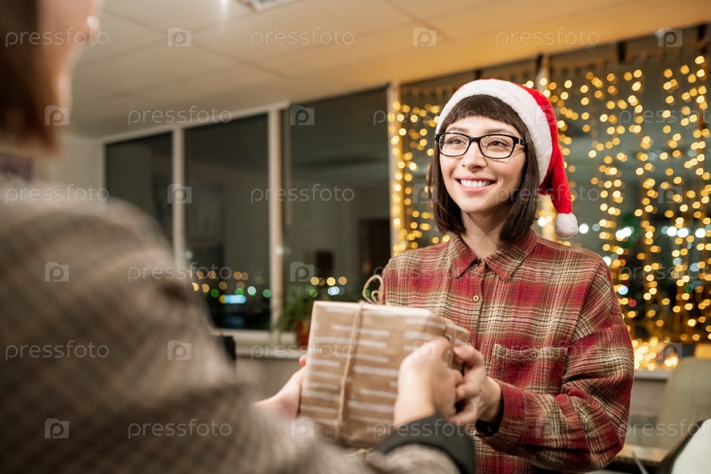 Красивая молодая бизнесвумен в Санта-Капе передает коробку с подарками коллеге на вечеринке