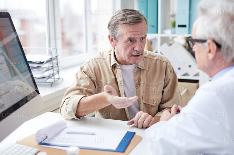 Пожилой пациент мужского пола в обычной рубашке сидит перед врачом и жестикулирует руку, обсуждая медицину с доктором в кабинете клиники