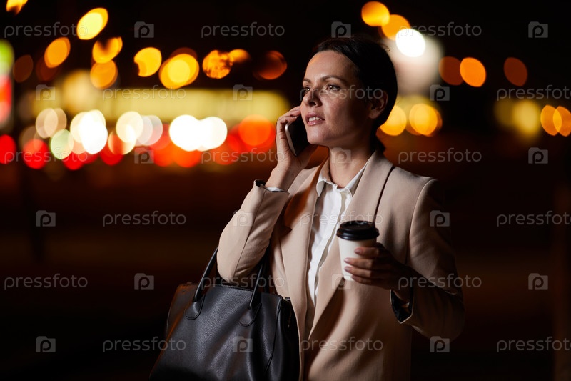 Уверенная в себе бизнес-леди средних лет с черной сумкой стоит на улице и звонит по телефону, ожидая коллеги на поздней встрече