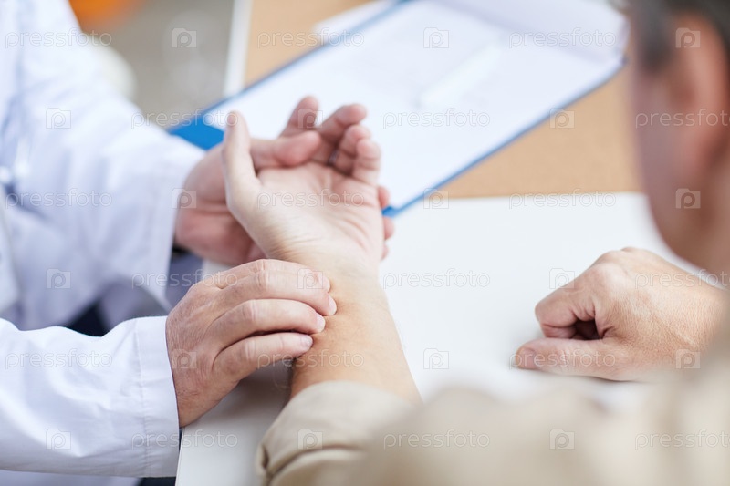 Близкий план неузнаваемого врача-мужчины в белом пальто, сидящего за столом и проверяющего пульс пациентов вручную