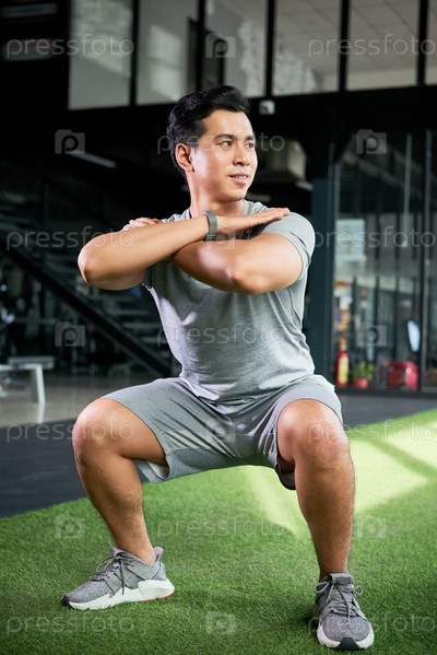 Улыбающийся мужчина делает приседания