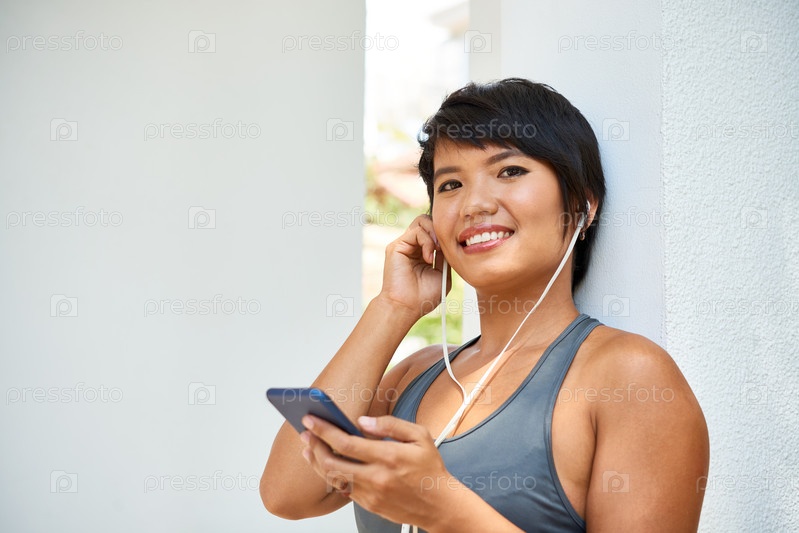 Веселая женщина в хорошей форме с телефоном