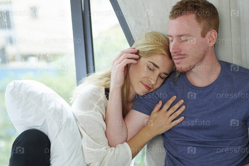 Женщина спит на плечах с мужчиной