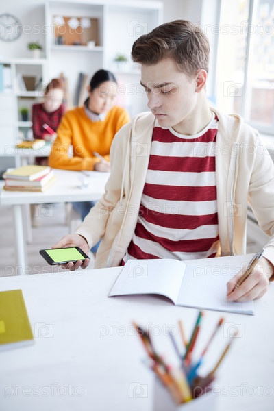 Серьезный красивый молодой человек в капюшоне, сидящий за столом и использующий смартфон во время мошенничества на экзамене
