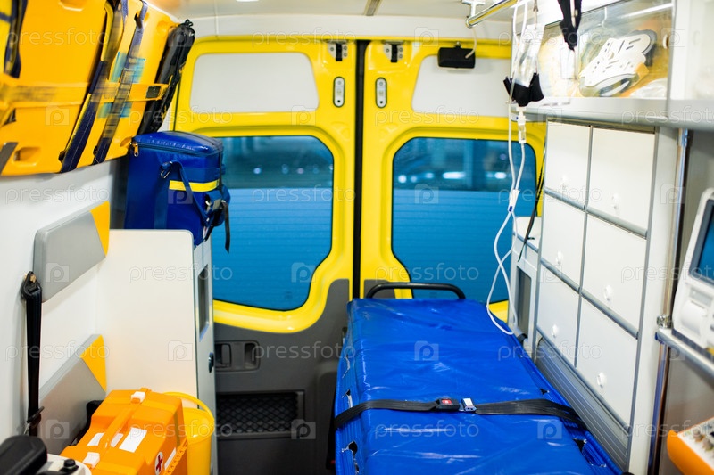 Интерьер современной машины скорой помощи с носилками и медицинским оборудованием