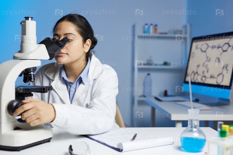 Серьезная молодая индийская женщина-химик в лабораторном пальто, сидящая за столом и использующая микроскоп в офисе лаборатории