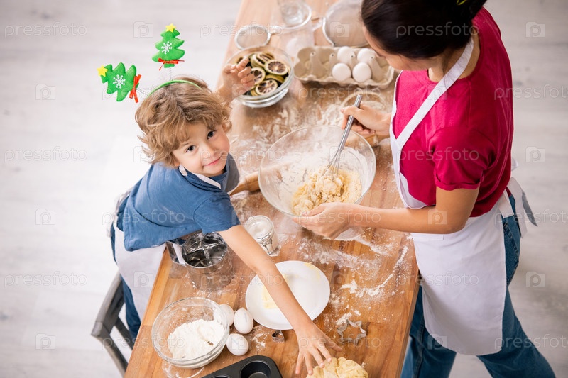 Очаровательный мальчик смотрит на тебя и растягивает руку к тесту, при этом склоняясь над столом