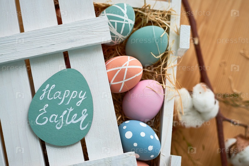 Непосредственно выше вид красочных окрашенных яиц с точками и полосами, помещенными в деревянную коробку со сенатом, Happy Easter надпись на поздравительной карточке