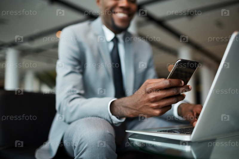 Чёрный бизнесмен использует смартфон и ноутбук в аэропорту