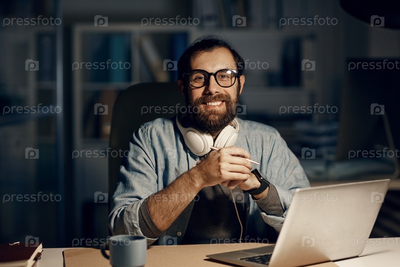 Портрет счастливого хипстера молодого бородатого мужчины в очках, сидящего за столом с ноутбуком в ночном офисе