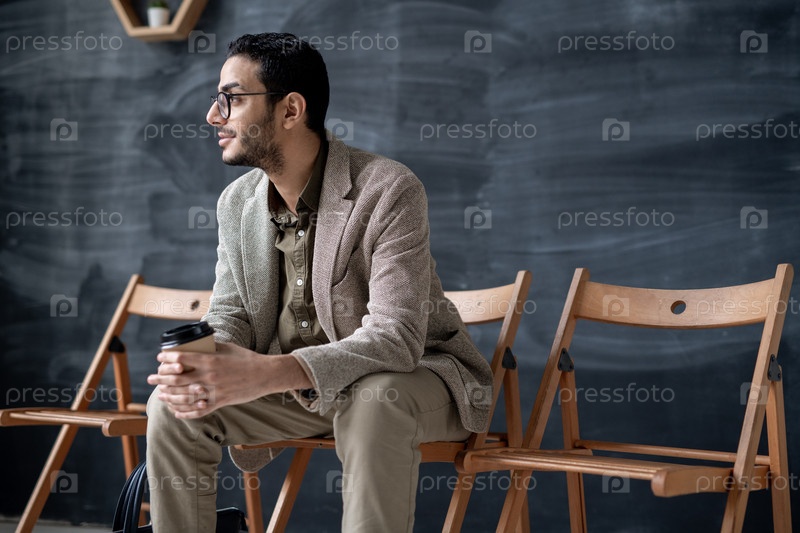 Молодой элегантный бизнесмен с бокалом кофе сидит на стуле в современном кафе