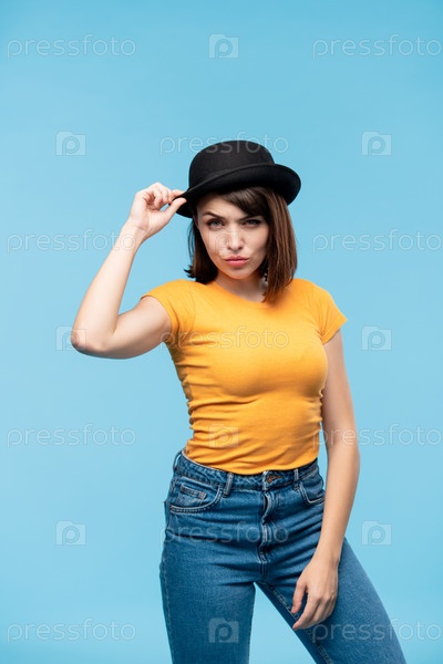 Молодая случайная женщина в черной шляпе, желтой футболке и синих джинсах