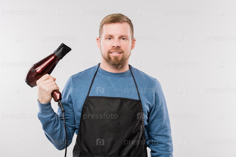 Молодой бородатый парикмахер в фартуке и синем пуловере, держащий фризер