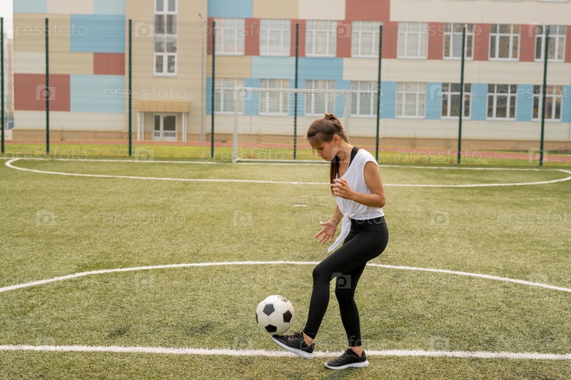 Молодая спортсменка в активной одежде, бьющая футбольный мяч во время тренировок на поле