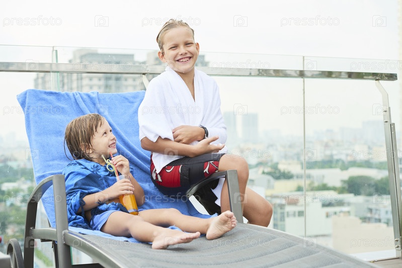 Два мальчика отдыхают на солнцезащитном кресле на свежем воздухе
