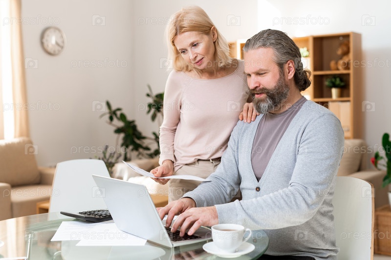 Счастливая зрелая пара смотрит на дисплей ноутбука, пока один из них вводит данные
