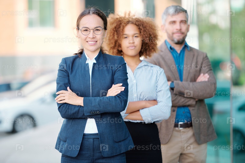 Ряд молодых успешных коллег в формальной одежде с женщиной-лидером перед ними