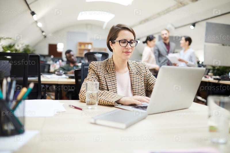 Уверенная в себе деловая женщина, работающая в офисе открытого пространства