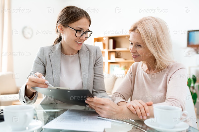 Счастливый молодой консультант и зрелая женщина обсуждают моменты финансового документа