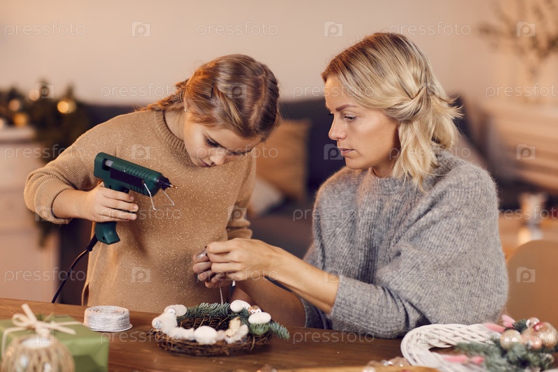 Серьезная молодая мать с светлыми волосами держит небольшую часть ленты, пока ее дочь наносит на нее горячий клей, они делают рождественский венок
