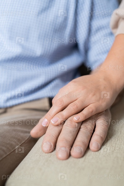 Рука молодой осторожной и любящей дочери на руке ее больного отставного отца