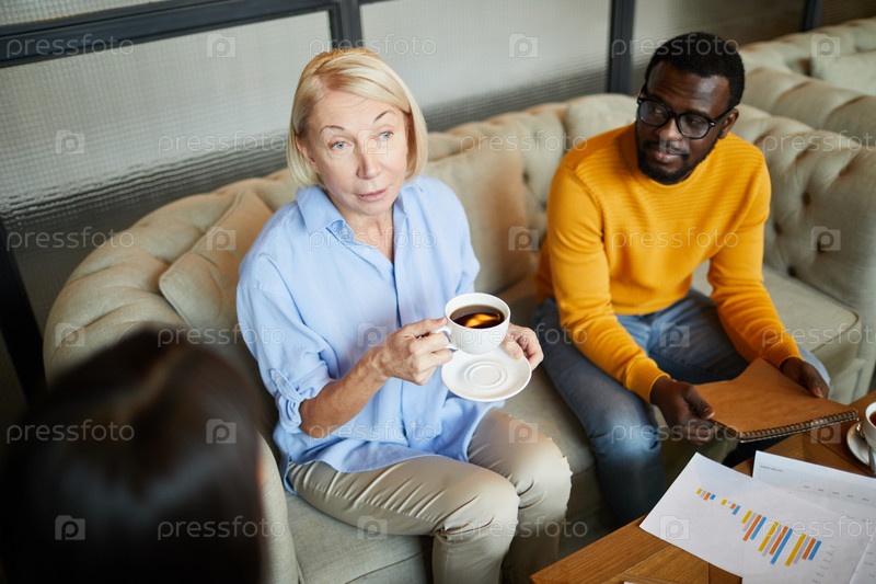 Содержание хмурится зрелая леди с светлыми волосами сидит на диване и пьет чай, обсуждая бюджет с аналитиками на неформальной встрече