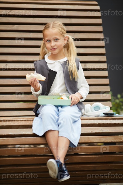 Маленькая девочка ест на свежем воздухе
