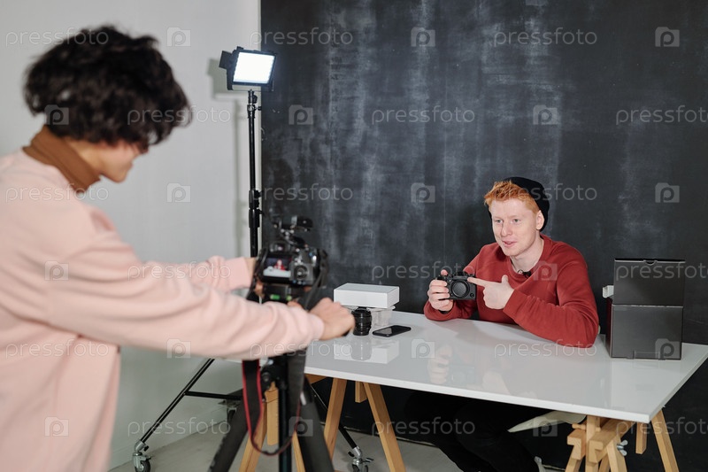 Молодой оператор стреляет в счастливого мужского блогера, указывающего на новую камеру