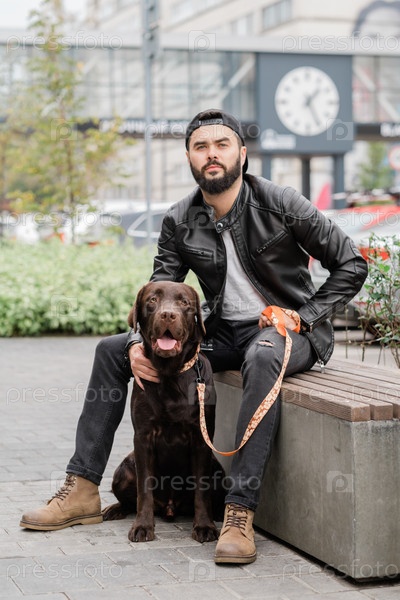 Молодой человек в черных джинсах и кожаной куртке отдыхает со своим питомцем