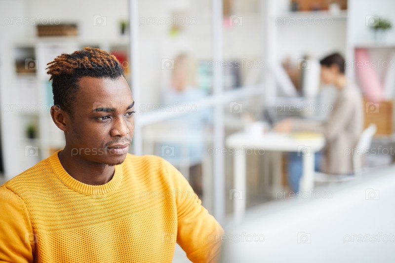 Серьезный концентрированный хипстер молодой чернокожий программист в желтом свитере смотрит на компьютерный монитор, работая над веб-дизайном в современном офисе