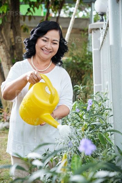 Старшая женщина поливает растения