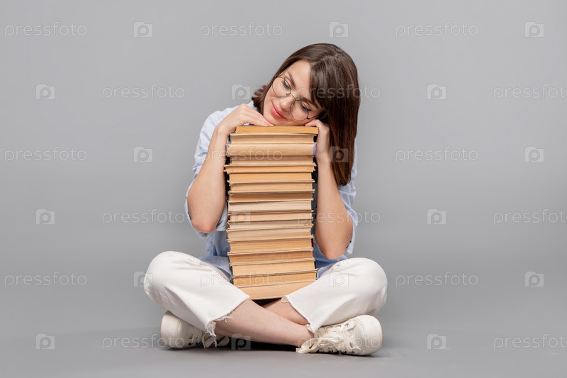 Умная студентка со скрещенными ногами, держащая голову над книгами